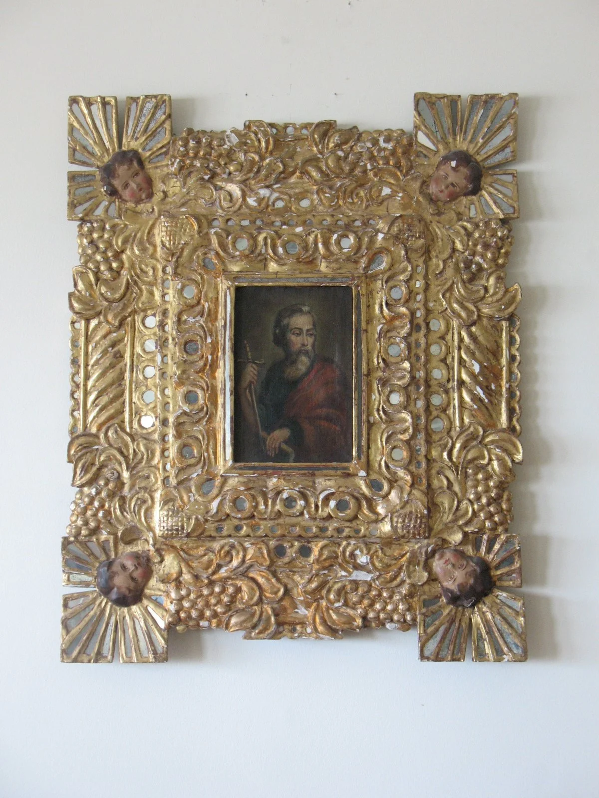 Gilt frame with mirror tile and cherub heads.